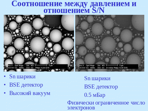 Здесь не видя пробу, заранее нельзя дать четких рекомендаций. Хотя фирма и дает некоторые приспособления, но они не могут пригодиться на все случаи жизни. Например, есть двусторонняя липкая проводящая лента. Однако, если Вам надо исследовать отдельные частицы порошка размером меньше микрометра, боюсь, что она будет бесполезна. Безвыходное положение? Конечно - нет. На металлическую поверхность насыпаем немного порошка и капаем одну каплю спирта. Устанавливаем в прибор, и можно анализировать. Изображение будет не хуже, чем на следующем слайде оловянные шарики.