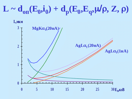 где А - атомный вес, Z - атомный номер, -плотность материала образца, E0 - начальная энергия электронов, Eq— конечная энергия электронов. Если рассматриваем рентгеновское излучение, то Eq -критический потенциал ионизации соответствующего уровня. Если рассматриваем отраженные электроны, то Eq - это энергия электрона на данной глубине.