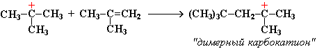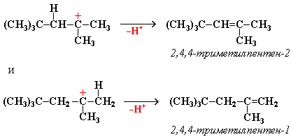 "Димерный карбокатион" стабилизируется путем выброса протона, что приводит к продуктам димеризации алкена – смеси изомерных диизобутиленов (2,4,4-триметипентена-2 и 2,4,4-триметилпентена-1):