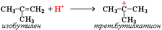 2. Димеризация алкенов – образование димера (удвоенной молекулы) в результате реакции присоединения. В присутствии минеральной кислоты (донора протона Н+) происходит присоединение протона по двойной связи молекулы алкена. При этом образуется карбокатион: