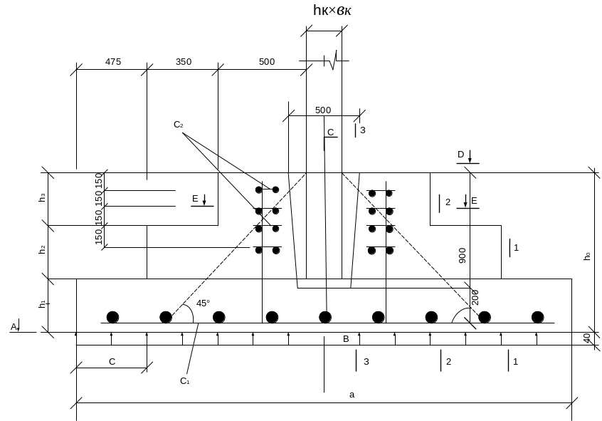 Розміри другої і третьої сходинок фундаменту приймають так, щоб внутрішні грані сходинок не перетинали пряму, проведену під кутом 450 до грані колони на відмітці верху фундаменту.