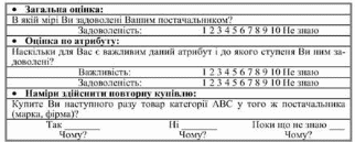 У загальному випадку аналіз проводиться в три етапи. Починають з оцінки ступеня інтегральної задоволеності товаром або постачальником, потім оцінюють задоволеність по кожному атрибуту і його важливість. Для цього використовують бальну шкалу, до якої додають можливість відповіді "не знаю". Нарешті, вимірюють намір зробити повторну купівлю. Типові запитання подано на рис. 8.3.