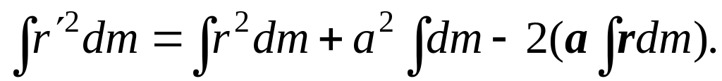Найдем связь между моментами инерции тела относительно двух различных параллельных осей. Предполагается, что эти оси перпендикулярны к плоскости рисунка и пересекают ее в точках О и А. Ради краткости будем называть эти самые оси также осями О и А. Разобьем мысленно тело на элементарные массы dm. Радиусы – векторы одной из них, проведенные от осей О и А параллельно плоскости рисунка, обозначим r и r, соответственно.