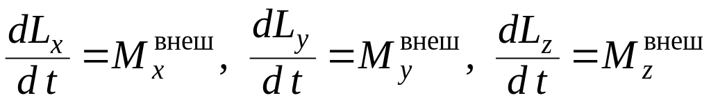 которые получаются из уравнения (4.4) путем проектирования на неподвижные оси декартовой системы координат. Индекс «внеш.», указывающий на то, что при вычислении момента сил внутренние силы могут не приниматься во внимание, в дальнейшем обычно будет опускаться. Таким образом, под М в уравнении моментов всегда будет подразумеваться момент внешних сил. Величины Lx и Мх называются соответственно моментами импульса и сил относительно оси Х. Аналогично говорят о моментах импульса и сил относительно координатных осей Y и Z.