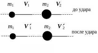 В случае прямого центрального удара векторы скоростей шаров до и после удара лежат на прямой, соединяющей их центры. Проекции векторов скорости на линию удара равны модулям скоростей. Их направления учтем знаками: положительное значение припишем движению вправо, отрицательное – движению влево. При указанных допущениях законы сохранения имеют вид