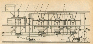 1 - бункер для зерна; 2 - привід мішалки; 3-чан попередньої замочки; 4 - гнучкий шланг, 5 - кільцевої оарботер; 6 - відокремлювач брудної води; 7 - замкові чани; 8 - резервуар для повітря: 9 - повітряний компресор, 10 -інерційний транспортер; 11 - відцентровий насос
