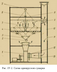 Одноярусна сушарка (Німеччина) (рис.1У-2) являє собою чотириповерхову будівлю, в якій розташовані: на першому поверсі вентилятор 1 з регулюючим шибером 12 і паровий калорифер 13 ; на другому поверсі бункер для прийому гарячого солоду 3 і розвантажувальний шнек 2; третій поверх обладнаний двостулковими поворотною гратами 4. на якій сушиться солод. Над гратами размешен гратчастий поміст 5, з якого робітник спостерігає за вантаженням свежепроросшего солоду і розвантаженням сухого солоду. На верхньому поверсі знаходяться шнек 7, що подає солод в сушарку, похила поворотна розподільна труба 8 і привід 6 для перекидання решітки з сухим солодом . Збоку до будівлі сушарки примикає вертикальний канал 10, в якому розташовані поворотна заслінка 9 та жалюзійні грати для забору свіжого повітря 11.