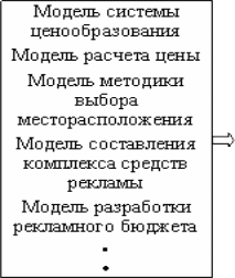 Банк моделей - это комплекс математических моделей, которые оказывают содействие при принятии наилучших маркетинговых решений участниками рынка. Каждая модель включает совокупность взаимозависимых переменных, являющихся некой реально имеющейся системой (процессом или итогом). Это модели сбыта продукции, модели выбора способа размещения рекламы и др. Они дают возможность получить ответы на вопросы: «а что, если?» или «что лучше?», например: