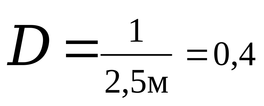 Оптична сила лінзи, фокусна відстань якої більша за 1 м, буде менша 1 дптр. Наприклад, оптична сила лінзи з фокусною відстанню 2,5 м дорівнює: