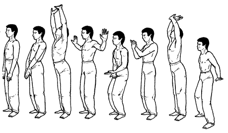 Согласно устной традиции эта школа возникла в древнем Китае из системы психофизического тренинга, известного в народе под названием «школа змеи и птицы». Но в своем настоящем виде оформилась в середине XIX века. Предлагаемый комплекс представляет собой законченную систему, проверенную многими поколениями. Все в нем глубоко увязано и в первую очередь – состав и последовательность упражнений. Правильно применяя их, вы сможете не только размять суставы, мышцы сухожилия, но и «проработать» кровеносную, нервную системы, внутренние органы. При нехватке времени на выполнение всего комплекса можно сократить количество упражнений, но это снижает эффективность занятий. Делая упражнение, концентрируйте внимание на самом движении или на рекомендуемых участках тела – это важный элемент в освоении искусства управления «внутренней энергией». Хотим подчеркнуть, что упражнения на растяжение сухожилий и мышц требуют особого контроля. Не допускайте сильной боли, однако надо иметь в виду, что нарастанию гибкости сопутствуют умеренные тянущие ощущения. Несколько советов по гигиене: – утром перед занятием обязательно выполните обычные утренние гигиенические процедуры; – не делайте упражнений, когда чувствуете сильный голод, и не ранее, чем через 1.5-2 часа после еды; – одежда должна быть свободной; при выполнении упражнений в перерывах на работе распустите ремень и галстук, расстегните ворот рубашки и снимите часы. Обычно по китайской традиции упражнения выполняют, стоя лицом на север. Запомните главное правило: соблюдайте постепенность в нагрузке, занимайтесь регулярно (лучше понемногу, но регулярно).