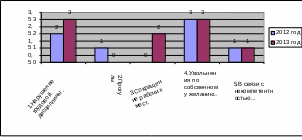 Данный рисунок наглядно показывает, что в 2013 г. увеличилось количество по причине нарушения трудовой дисциплины и по собственному желанию. Увольнения по собственному желанию, связаны с неудовлетворенностью персонала системой мотивации на предприятии.