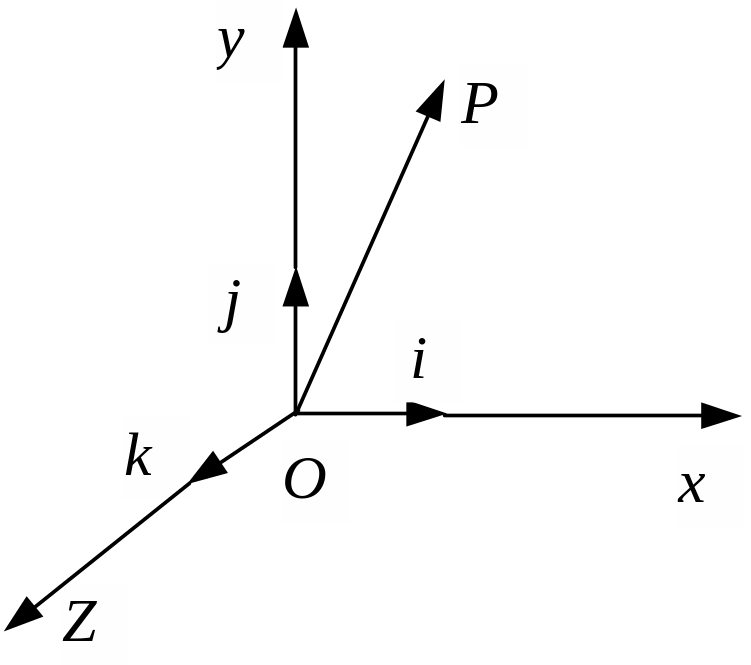 Единичные векторы, задающие направления осям Ox, Oу, Oz, обозначаются буквами i, j, k и образуют ортонормированный базис.