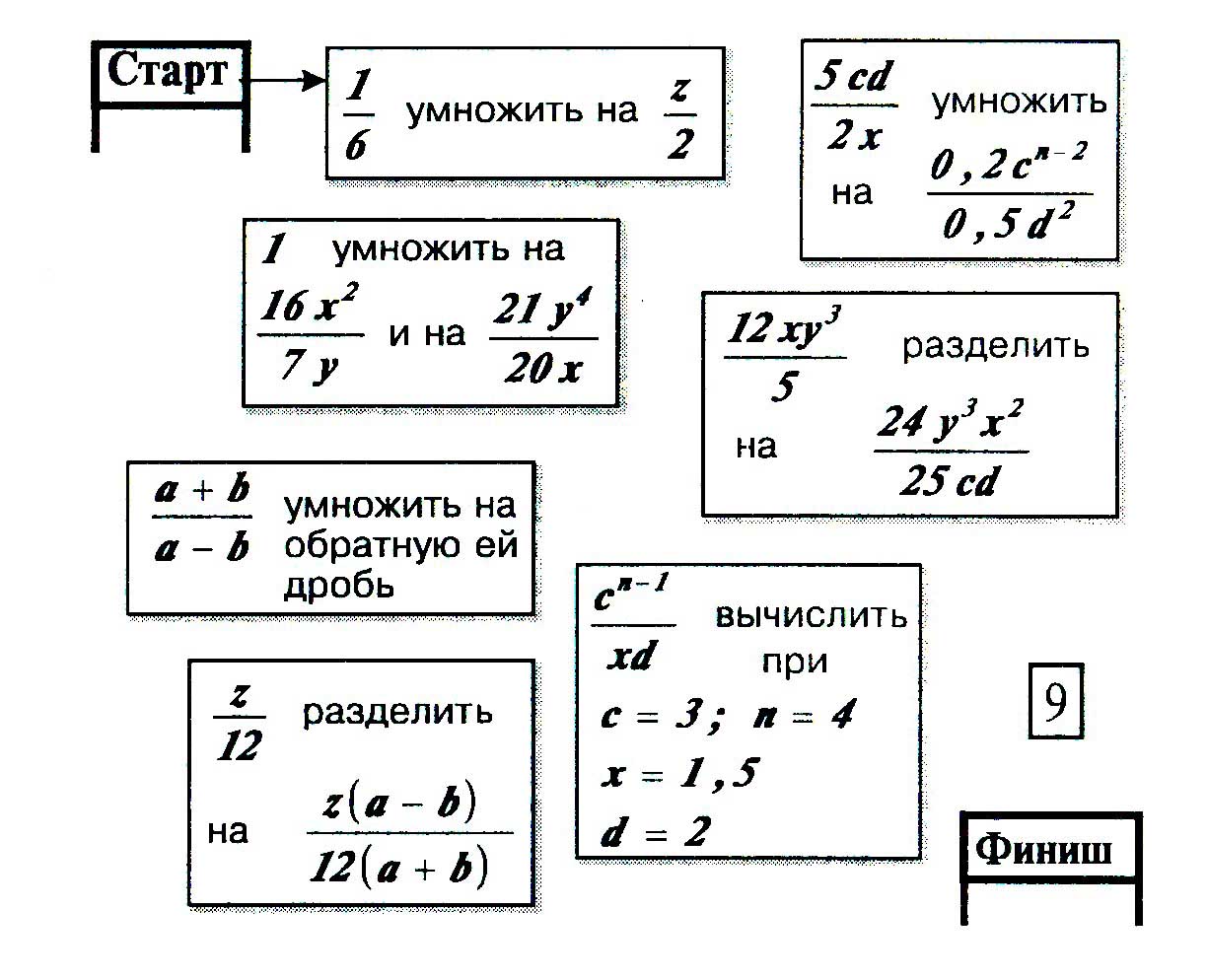 483. Найдите путь от старта к финишу, двигаясь от карточки к карточке. Ориентироваться нужно на результат выполняемых действий в каждой карточке. Результат первой карточки следует найти в начале одной из следующих.
