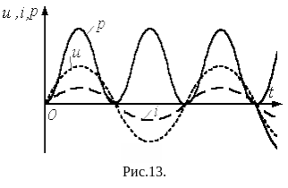 Здесь напряжение и ток (см. рис. 12 а) совпадают по фазе (=0), поэтому мгновенная мощность p=ui всегда положительна,