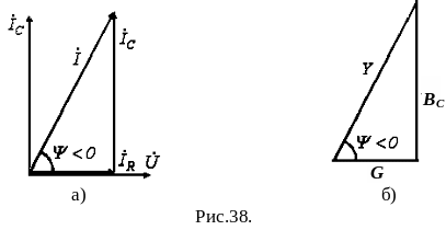 Треугольник проводимостей, подобный треугольнику токов, приведен на рис. 38 б.