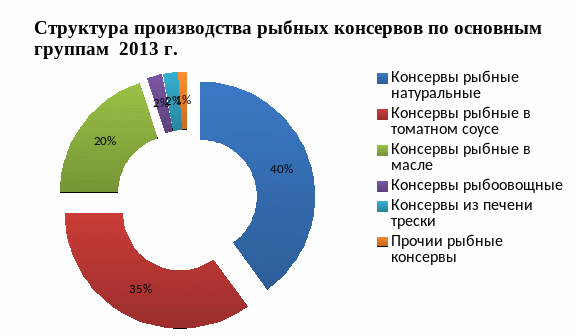 В структуре общего объема производства рыбных консервов основную долю занимали консервы рыбные натуральные (40%), консервы рыбные в масле (35%), консервы рыбные в томатном соусе (20%). При этом за I полугодие 2013 г. по отношению к I полугодию 2012 г. за счет роста производства увеличилась доля в общем объеме производства консервов рыбных натуральных (на 1,5 пункта), консервов из печени трески (на 1,6 пункта). В то же время снизилась доля консервов рыбных в масле (на 1,4 пункта) и консервов рыбных в томатном соусе (на 1,1 пункта).