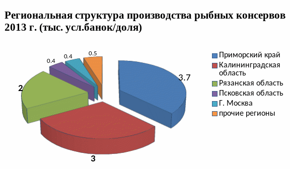 В производстве консервов рыбных натуральных лидерам являлись: Приморский край с долей 59,5% или 58,9 млн. условных банок в общем объеме производства этих консервов и Рязанская область – 3,6% или 5 млн. условных банок.