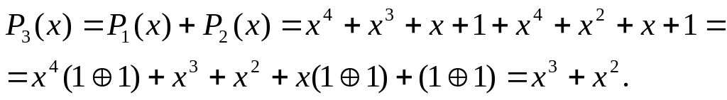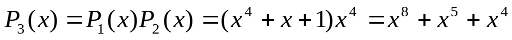 Рассмотрим код с n=5. Возьмем P1(x)=x4+x+1 и Р2(x)=x4. Произведем обычное умножение полиномов: