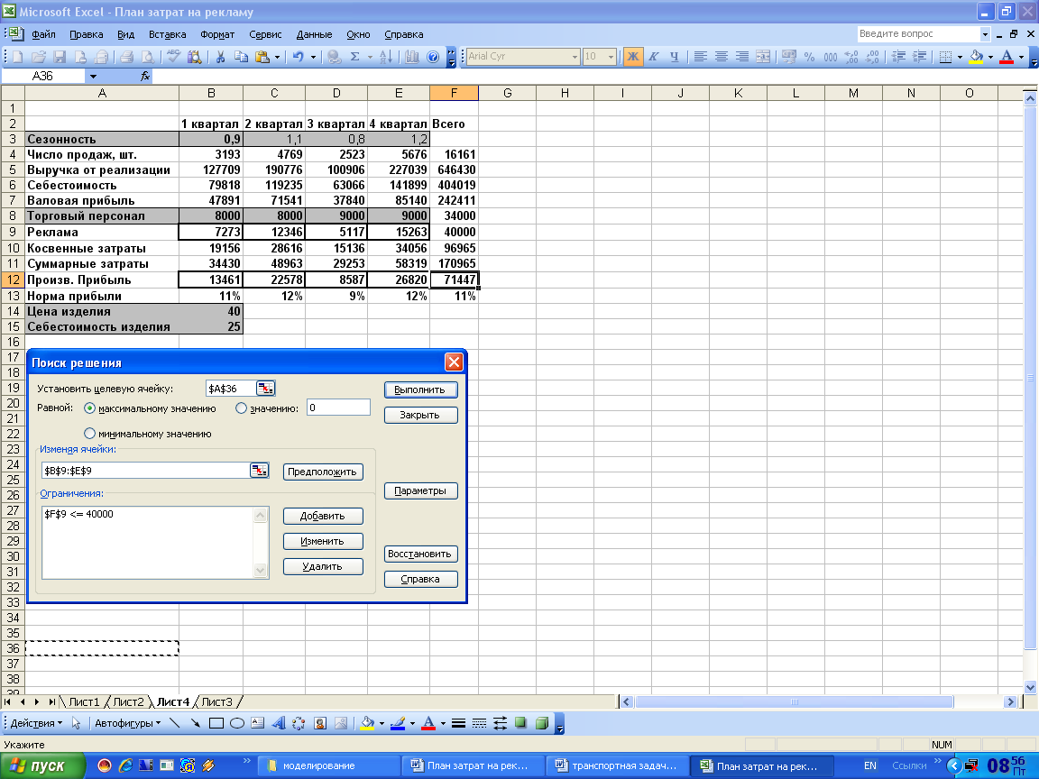 Введем ограничение расходов на рекламу, допустим расходы на рекламу за 4 квартала не должны превышать 40000 уд.ед. (соответственно изменить содержимое диапазона B9:E9) (рисунок 3). Результаты ограничения отражены в таблице 8.