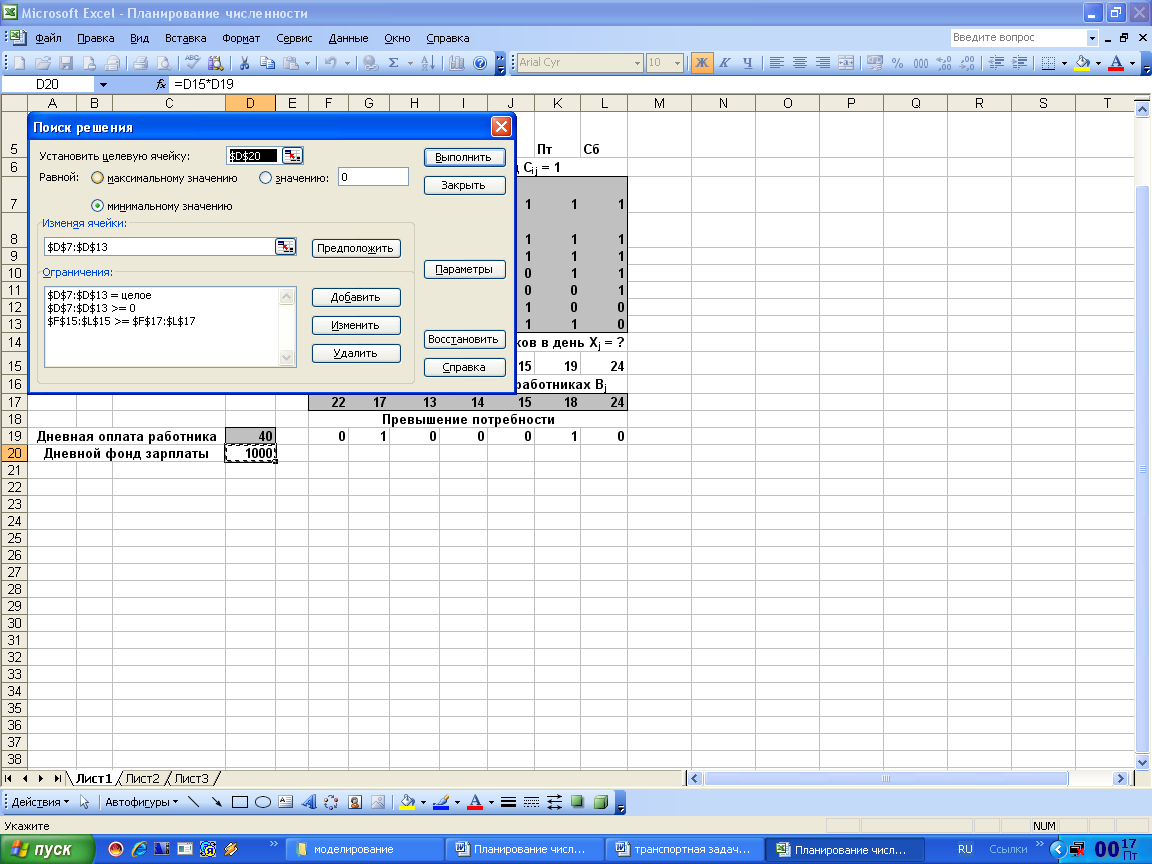Составить оптимальный план вручную, меняя данные в графе Количество работников (D7:D13) добиться минимального Дневного фонда зарплаты (D20). Контролировать превышение ежедневного количества работников над потребностью (F19:L19). Для всех дней недели оно должно быть положительным.