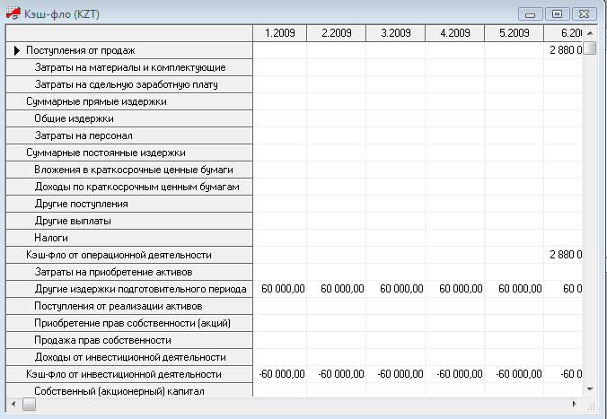 Инвестиционная деятельность отражает ежемесячные поступления траншей кредита по 60 000 тенге. После возврата кредита и процентов можно получать чистую прибыль. Нижняя строка Кэш-фло содержит данные о сумме на счете предприятия.