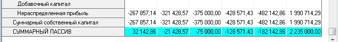 Просмотрев таблицу Кэш-фло, можно убедиться, что такой проект не может состоятся в принципе, поскольку испытывает дефицит средств в первые пять месяцев (рисунок 14). Об этом свидетельствуют и данные таблицы Баланс — денежные средства имеют отрицательные значения в течение пяти месяцев.