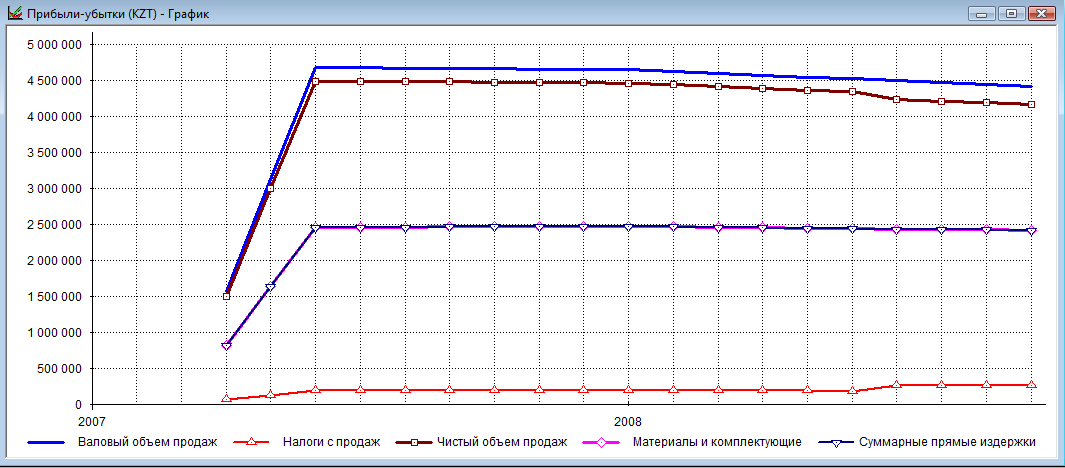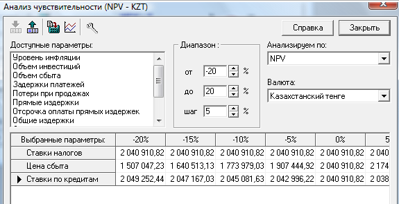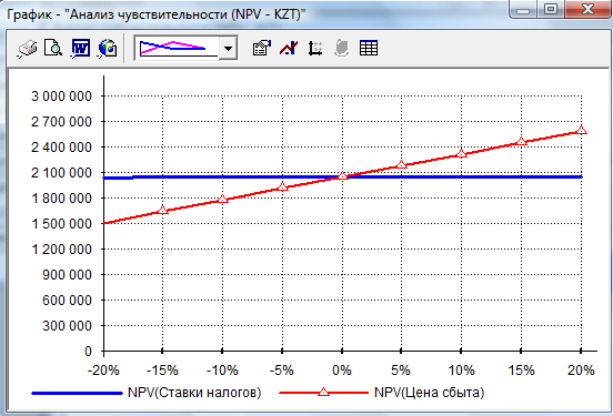 При анализе проекта можно также оценить чувствительность его к отклонениям различных факторов. Для этого предназначен модуль Анализ чувствительности. Попробуем исследовать влияние ставок налогов и цены сбыта на показатель Анализ по NPV. Нужно выбрать его из списка параметров, Нажать кнопку Добавить параметр, определить диапазон от -20 до +20 % с шагом в 5 % и нажать кнопку Рассчитать. Получаем рассчитанную таблицу (рисунок 25) и соответствующий график (для этого нужно выделить обе строки таблицы и нажать кнопку График) (рисунок 26). На графике видно, что, например, для получения NPV в размере 2 600 000 тенге нужно увеличить цену сбыта на 20%.
