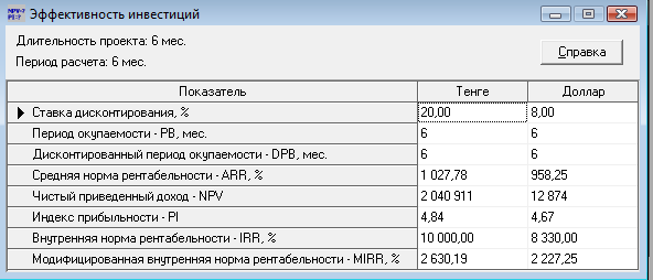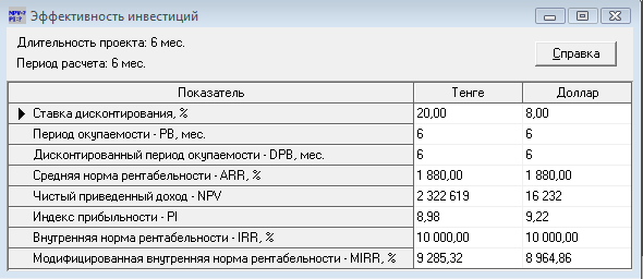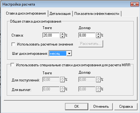 Теперь нужно приблизить анализ проекта к реальным условиям. Для начала определяют ставку дисконтирования. В разделе Проект в окне Настройка расчета следует выбрать ставку дисконтирования для тенге 20 %, а для долларов 8 % и определить шаг дисконтирования равным одному месяцу (рисунок 12).