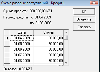 Для изыскания средств нужно использовать настройки раздела Финансирование окна Займы. Далее следует задать размеры кредита (300 000 тенге. на пять месяцев) и определить схему поступления (по 60 000 тенге на пять месяцев (рисунок 15)).