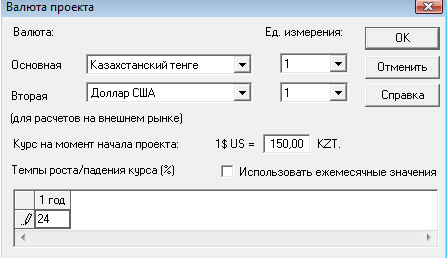В разделе Окружение следует описать валюту проекта: в качестве основной валюты — тенге, в качестве второй валюты — доллары США. Курс в начале проекта — 150 тенге за доллар, инфляция — 24 % (рисунок 5).