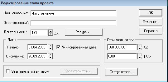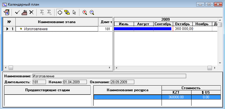 Левая часть окна Календарный план включает описание этапов, правая представляет графическое изображение плана (диаграмма Ганта) (рисунок 9). График можно перемещать, отражая изменение плана или просто передвигая его влево или вправо указателем мыши.