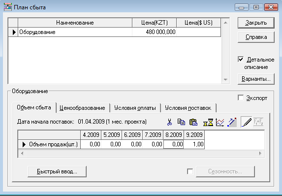 В разделе Операционный план составляют план сбыта. В данном случае имеется только один продукт, и он уже обозначен в плане как Оборудование. Остается только указать договорную цену (480 000 тенге.) и определить объем продаж (1 шт.) в конце периода—в шестом месяце. До этого реализация равна нулю (рисунок 10).