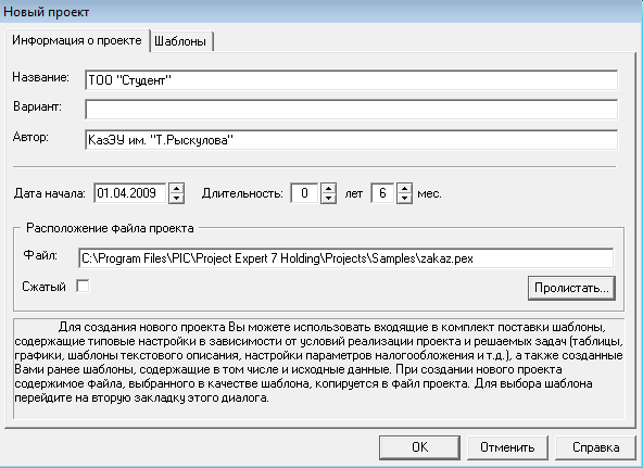 Создаем новый проект. Указываем название, имя файла (например zakaz) и дату начала работы (1.04.09). В качестве заготовки можно использовать шаблоны или ранее создававшиеся проекты (рисунок 1).