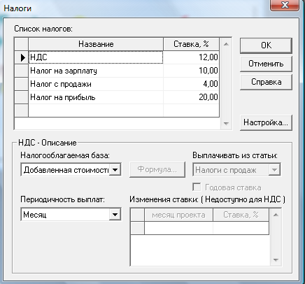 Теперь пришло время учесть налога и еще более приблизиться к реальности. В разделе Окружение следует открыть окно Налоги и определить НДС — 12 %. Нажав кнопку Настройка, определим, что переплаченный НДС переносится в будущие периоды.