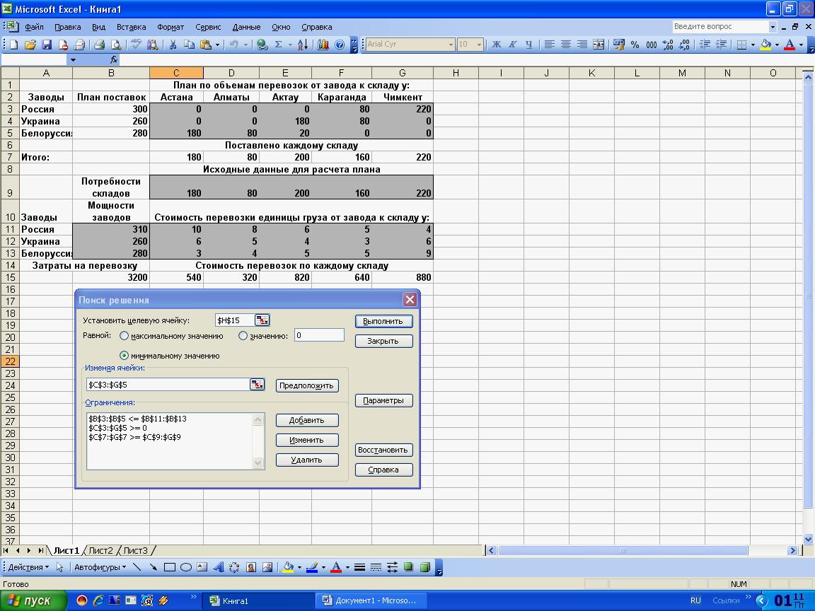 Составить оптимальный план вручную, меняя данные в плане перевозок C3:G5, добиться при этом минимальной стоимости перевозок в ячейке В15 и при этом наблюдать, чтобы план поставок в ячейках В3:В5 не превышал мощности заводов в ячейках В11:В13. Поставки каждому складу не должны быть меньше их потребностей.