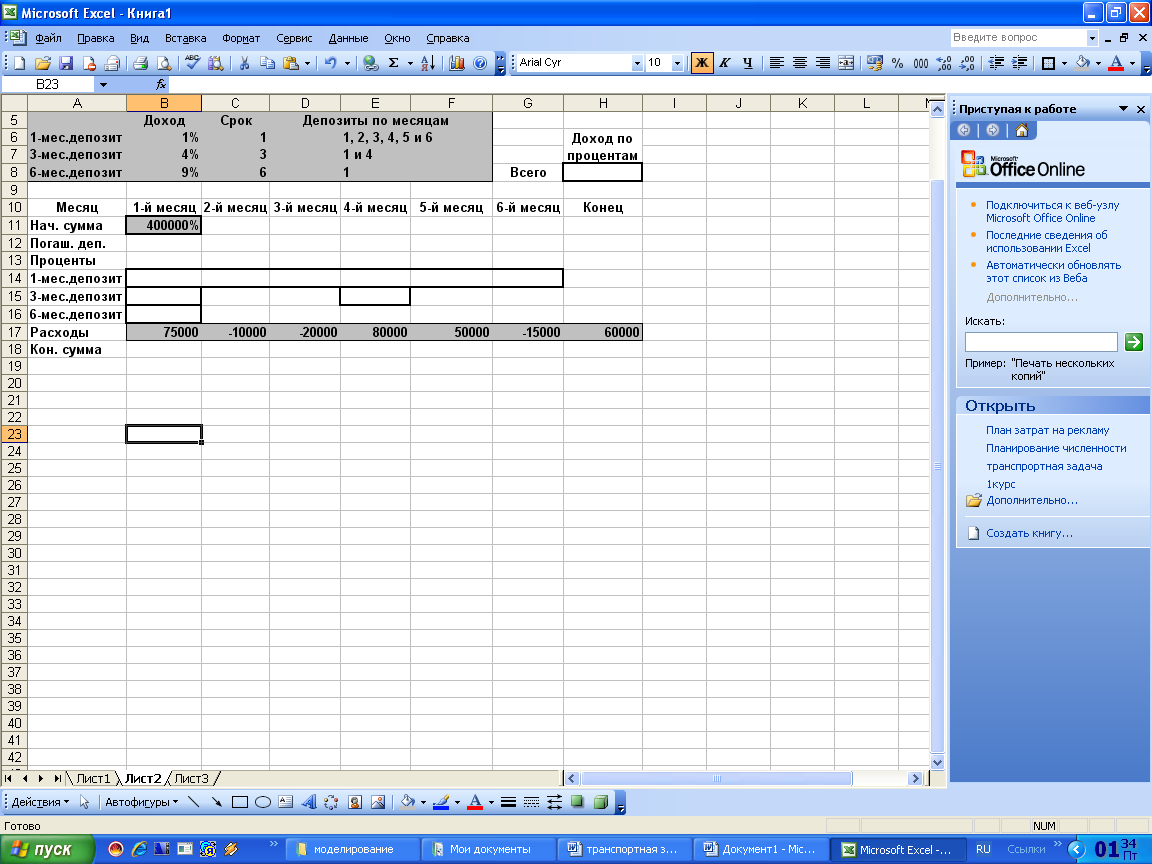 Необходимо определить 9 сумм: ежемесячные суммы для 1- месячных депозитов; суммы депозитов 1-го и 4-го месяцев для квартальных депозитов; сумму 6- месячного депозита в 1-м месяце. Предполагается, что суммы депозитов и проценты возвращаются (погашаются, поступают) постнумерандо (в конце месяца), а инвестируются пренумерандо (в начале месяца).