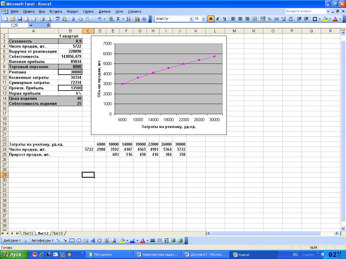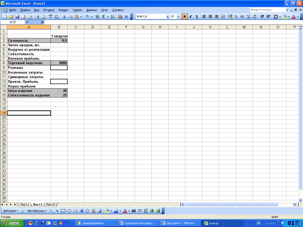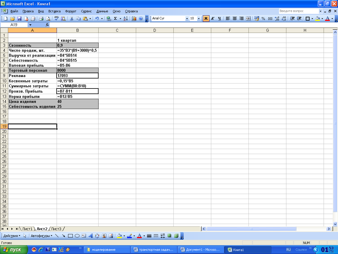 Исходными данными являются коэффициент сезонного изменения объемов продаж, затраты на торговый персонал, цена и себестоимость изделия. Искомыми показателями являются затраты на рекламу и производственная прибыль.