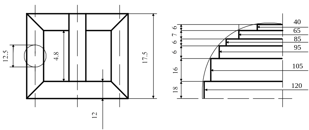 Выбираю конструкцию плоской трёхфазной стержневой шихтованной магнитной системы, собираемой из пластин холоднокатаной текстурной стали со стыками: Четыре крайних стыка стержней и ярм косые, на среднем стержне стыки прямые. В сечении стержня шесть ступеней без каналов. Сечение ярма повторяет сечение стержня, в котором объединяются два крайних пакета . Размеры пакетов по [1] табл.8-1.