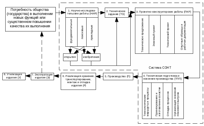 Блоки 1—4 (научно-исследовательские работы, техническое задание, проектно-конструкторские работы, технологическая подготовка и освоение производства) формируют - систему создания освоения новой техники (СОНТ). Это совокупность взаимосвязанных процессов, обеспечивающих научную, конструкторскую, технологическую и организационную готовность предприятия (объединения) к выпуску нового изделия заданного уровня качества. В процессе СОНТ устанавливаются плановый объем выпуска, сроки окончания всех стадий и этапов подготовки и освоения производства, уровень необходимых затрат.
