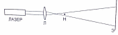3. Включите в сеть блок питания лазера и приступите к юстировке оптической схемы. Свет полностью выключать не следует, однако его необходимо по возможности приглушить. Направьте луч лазера в центр экрана, после чего установите на пути луча собирающую линзу. Луч лазера фокусируется линзой, и после фокуса образуется расширяющийся пучок света. На экране при этом возникает освещенное пятно диаметром 10 – 15 см (в зависимости от расстояния до экрана).