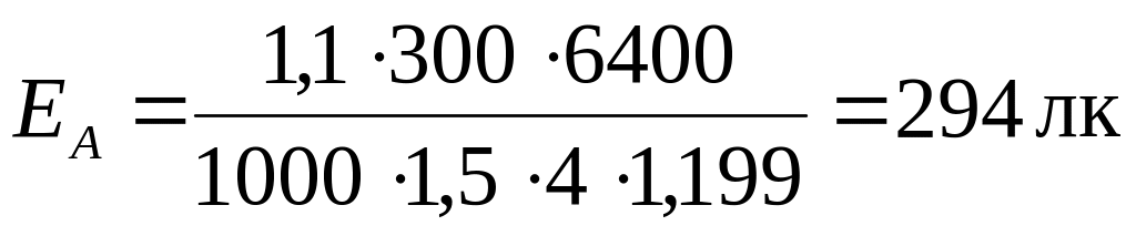 Световой поток светильника ПВЛМ240 Вт – Фсв=23200=6400 лм. Длина ЛЛ-40 Вт – 1199 мм. Коэффициент запаса Кз=1,5. =1,1. Тогда освещенность в точке А составит: