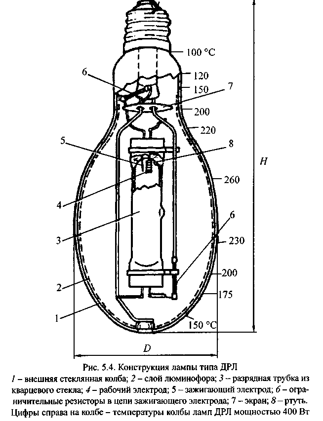 Дуговая ртутная люминесцентная лампа (рис. 5.4) состоит из кварцевой трубки (горелки), расположенной в стеклянной колбе, внутренняя поверхность которой покрыта тонким слоем люминофора, способного преобразовывать ультрафиолетовое излучение, сопровождающее дуговой разряд в трубке, в видимый свет, пригодный для освещения. В трубку, выполненную из кварцевого стекла, впаяны два основных вольфрамовых электрода, покрытых активированным слоем и подсоединенных к центральной части цоколя лампы, и два дополнительных электрода (зажигающих). В трубке имеется капелька ртути (25-165 мг). После откачки воздуха для поддержания стабильности свойств люминофора колба заполняется чистым инертным газом (аргоном).