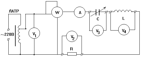 Сыйымдылықтар жиыны, индуктивті катушка және активті кедергі бір-бірімен тізбектеліп жалғанған. Тізбектегі ток күшін өлшеу үшін амперметр тізбектеліп жалғанған. Реостаттағы R, сыйымдылықтар жиынындағы C және индуктивтік катушкадағы L, кернеулерді өлшеу үшін V2, V3,V4, вольтметрлері оларға параллель жалғанған.