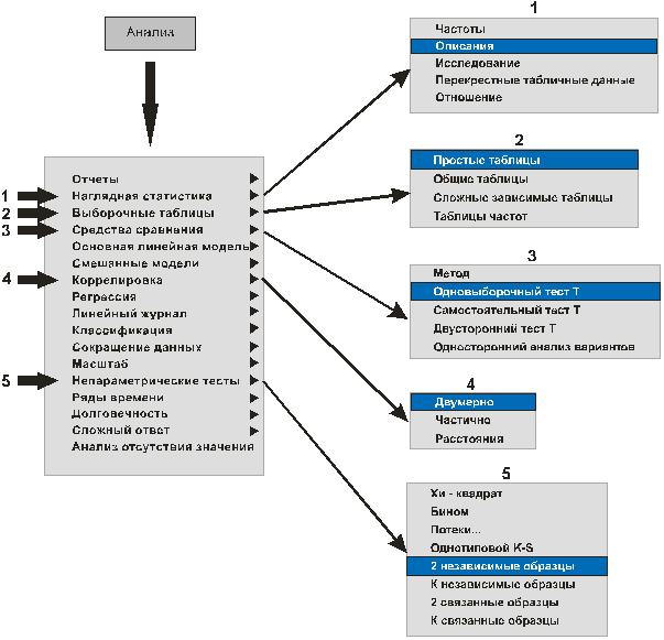 После нажатия на кнопку «Анализ» на экране появится окно, представляющее список основных категорий статистических операций, предлагаемых программой SPSS. Как показано на рисунке 21, остановка курсора на одной из строк списка раскрывает окно с дополнительным списком статистических процедур в рамках данной категории.