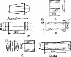 В качестве примера на рис.23. приведена последовательность ковки полого массивного цилиндра из слитка на гидравлическом прессе. Цилиндр куют из стального слитка (сталь 40) массой 18 т с пяти нагревов. После первого нагрева протягивают прибыльную часть под патрон и сам слиток на диаметр 1000 мм, отрубают донную и прибыльную части слитка (рис.23, а). После второго нагрева выполняют осадку, прошивку отверстия и раскатку на оправке (рис.23, б). После третьего нагрева – посадку на оправку и протяжку на длину 1100 мм (рис.23., в). После четвёртого – посадку на оправку и протяжку средней части на диаметр 900 мм (рис.23, г). После пятого нагрева (нагревают только конец А) заковывают конец А.