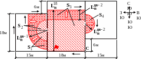 На схему, выполненную в масштабе, наносим путь, пройденный огнем за время равное 15 мин. (рис. 1.2.2). В западном и восточном направлении на 15-й минуте огонь достигнет стен центрального помещения, произойдет изменение формы площади пожара с угловой на прямоугольную.