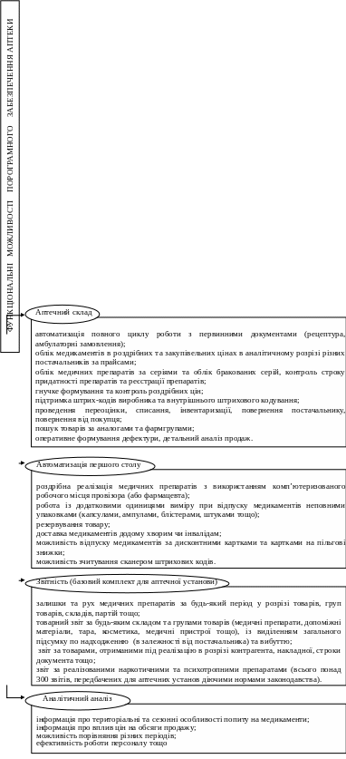 Різні групи користувачів формують свої, окрім вищезазначених, специфічні вимоги до програм. І чим більшій кількості цих вимог відповідає програма, тим вищий її рівень. Програмне забезпечення, яке використовується в аптечній установі повинно мати ряд галузевих функціональних можливостей, які реалізовуються на декількох рівнях: аптечний склад, звітність (базовий комплект для аптечної установи), автоматизація першого столу (роздрібна торгівля) та аналітичний аналіз (рисунок 3.1).