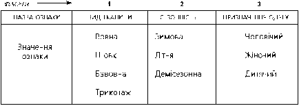 Розглянемо як гіпотетичний приклад фасетну класифікацію одягу в разі використання трьох ознак (фасетів): вид тканини, сезонність, призначення (рис. 2).