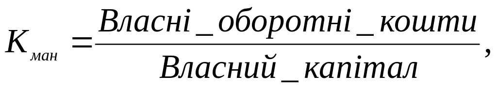 Коефіцієнт маневреності власного капіталу показує, яка частина власного оборотного капіталу знаходиться в обороті, а яка капіталізована. Коефіцієнт повинний бути досить високим, щоб забезпечити гнучкість у використанні власних коштів підприємства. Формула розрахунку цього коефіцієнта має наступний вид: