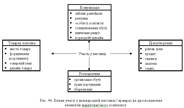 Презентація –– офіційне представлення підприємства, проекту, продукції, товару цільовій аудиторії (спеціально запрошеним особам). Вона провадиться, як правило, в межах міжнародних виставок, під час зарубіжних відряджень або при ознайомленні гостей з фірмою. Успішна презентація закладає основи майбутнього спільного бізнесу, закріплює позиції фірми на ринку, розширює коло споживачів/покупців продукції. Тому кожна презентація повинна ретельно готуватися. Підготовка до презентації складається з таких обов’язкових дій: уважний і детальний аналіз потенційної аудиторії; чітке визначення основної теми/проблеми презентації; формулювання мети презентації (одним чітким і коротким реченням); розробка логічного плану виступу; підготовка висновку виступу та вступного слова; підготовка та тренування використання допоміжного матеріалу (схем, таблиць, графіків, проспектів, зразків тощо). Критеріями високоякісної презентації є: точність, об’єктивність, повнота, релевантність, висока якість, зрозумілість та неупередженість. Міжнародні переговори –– це безпосередні маркетингові комунікації між партнерами з метою досягнення узгодженості відносно предмета переговорів, яка відповідає стратегічним чи тактичним цілям сторін. Процес міжнародних ділових переговорів може бути розподілений на п’ять стадій: підготовка до переговорів (збір інформації, формулювання мети, вироблення стратегії, формування команди спеціалістів, підготовка документів); початок обговорення (контроль порядку денного та графіка роботи, створення атмосфери переговорів, боротьба за лідерство); обговорення (з’ясування всіх аспектів майбутнього співробітництва, відстоювання власної позиції, розгляд аргументів партнера); підписання угоди (визнання важливості документа, що підписується, демонстрація готовності до співробітництва); дїї після переговорів (налагодження постійних особистих контактів, контроль за ходом виконання угоди). Зарубіжні відрядження — виконання робітниками службових завдань за кордоном. Відрядження може мати одну або декілька наступних цілей: первісний, ознайомчий візит для вивчення структури ринку та соціально-економічного середовища перед початком дослідницької кампанії; відвідання зовнішньоторговельної місії та Торговельно-промислової палати; участь у міжнародній виставці; проведення польового маркетингового дослідження або попереднього дослідження ринку; оновлення бази даних, пошук специфічної інформації щодо ситуації, що склалася; вирішення поточних справ з агентом (призначення, заміна, обговорення різних аспектів його діяльності, розгляд рекламацій тощо); вирішення поточних справ зі співробітниками представництва, філіалу тощо; перевірка можливостей розширення діяльності. Коли б не планувалося зарубіжне відрядження, особливо важливо встановити конкретні цілі поїздки та розробити відповідний план дій. Успіх відрядження значною мірою залежить від того, наскільки ретельно був організований підготовчий етап, який складається з таких приготувань: вироблення маршруту-графіка; підготовка документації; організаційне забезпечення (транспорт, засоби зв’язку, оплата послуг, відповідний одяг, необхідні ліки тощо); ознайомлення з найбільш вагомими соціально-культурними факторами (бізнесмену необхідно знати основні 